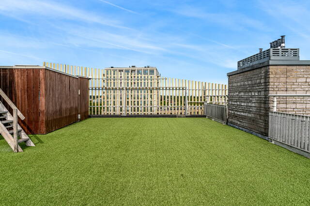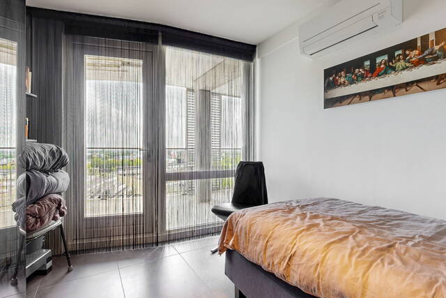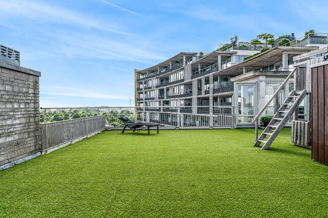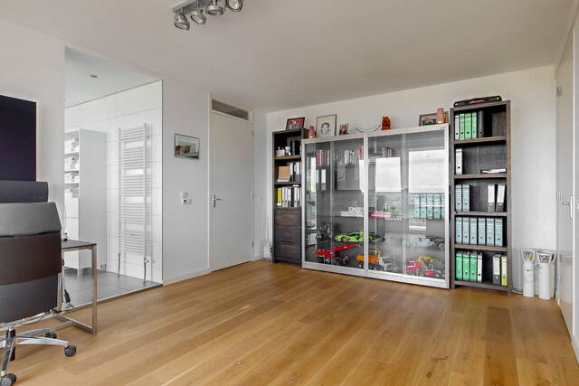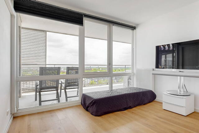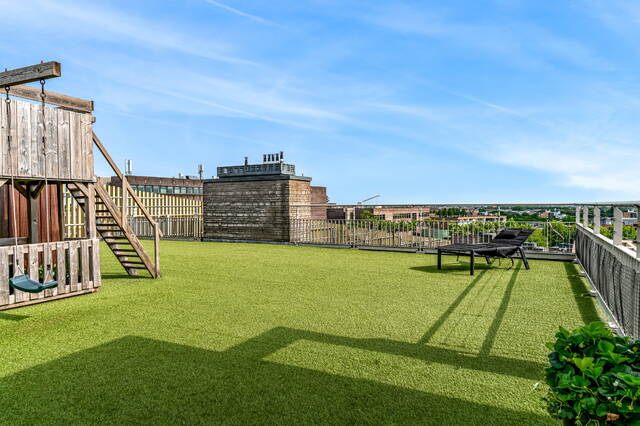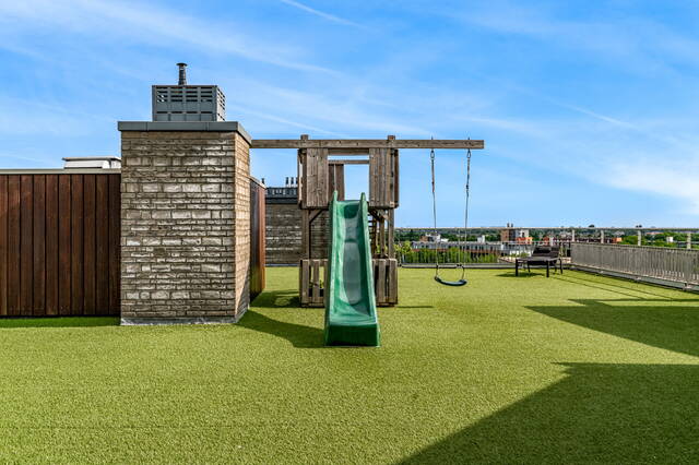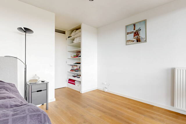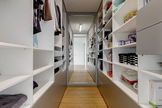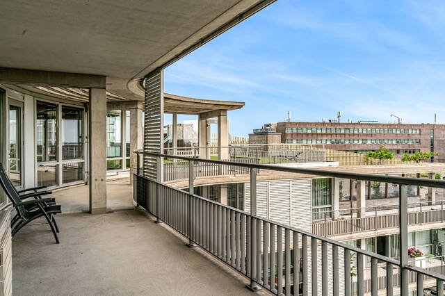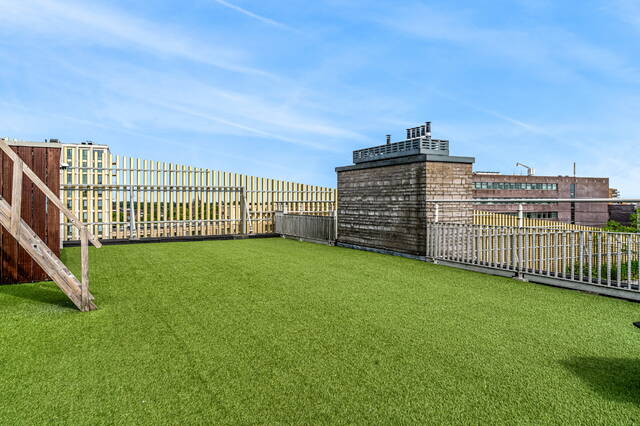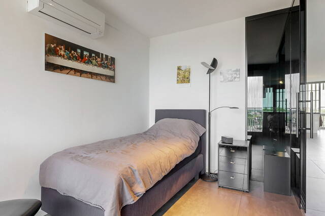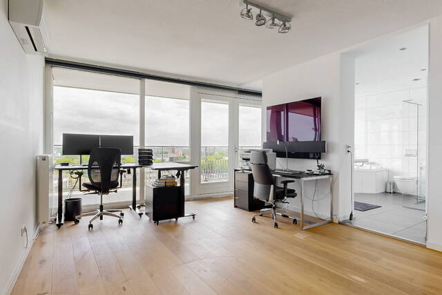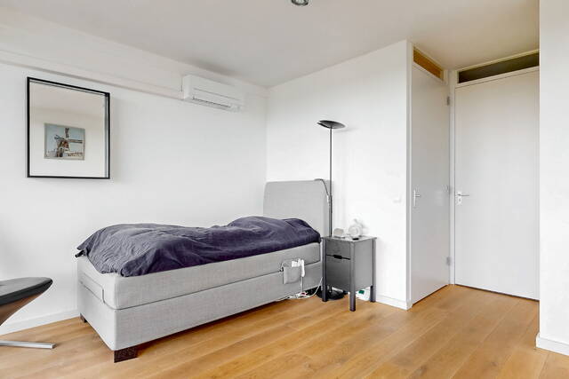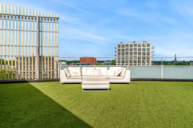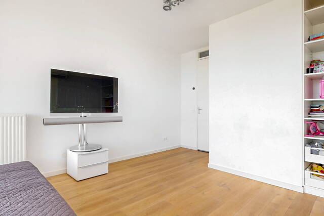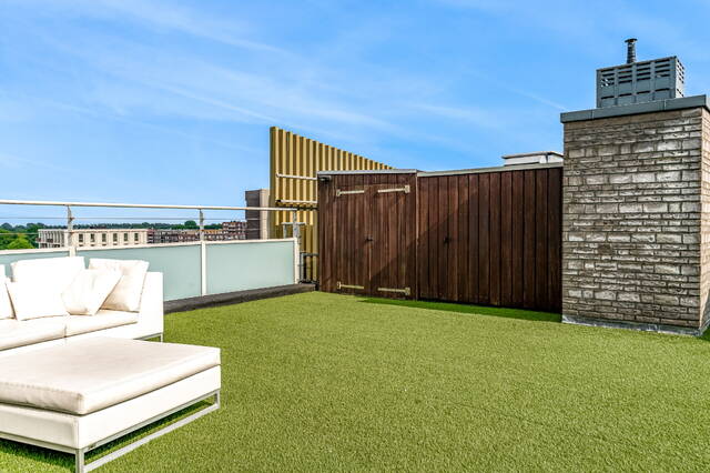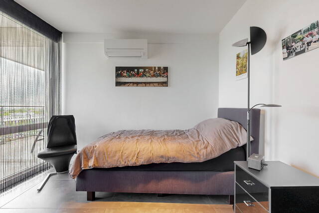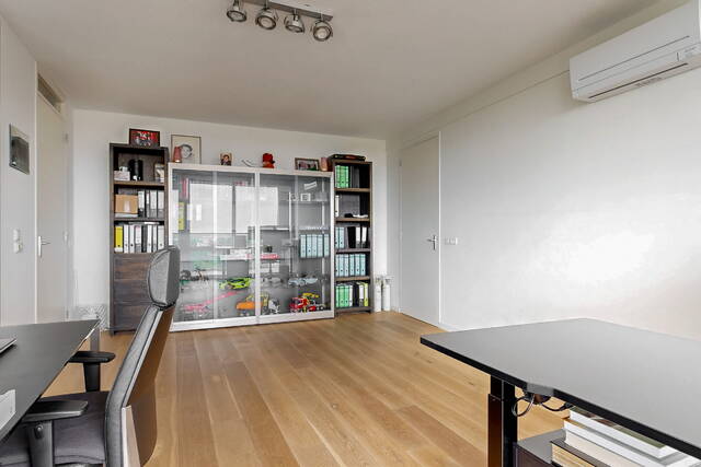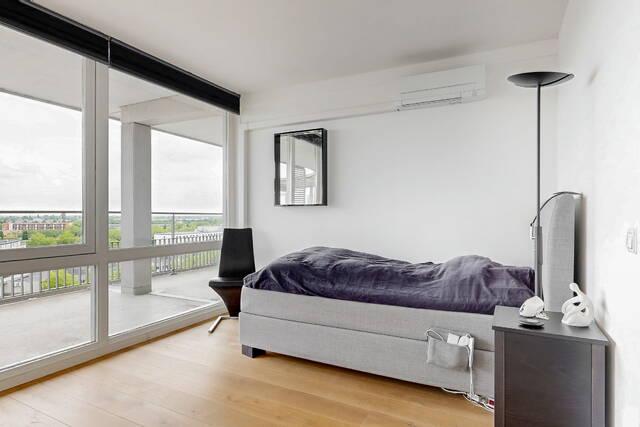 The connecting hall between the different rooms is a wonderfully quiet space with access doors to the bedrooms, the toilet room, the boiler room and the laundry room. The toilet room is fully tiled and equipped with a free-hanging wall-mounted toilet and a sink. The bedrooms & bathrooms: The penthouse has 3 spacious bedrooms, 2 of which have an ensuite bathroom. All bedrooms have an oak floor and air conditioning. The spacious master bedroom of over 40m2 further emphasizes the 'penthouse feeling'. From the bedroom, access to the balcony on the inner ring via French doors with a passage to the roof terrace. A bathroom that you can walk around in and a lockable walk-in closet.