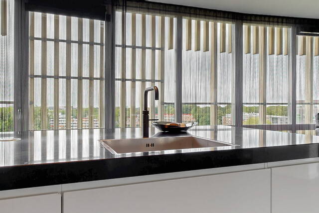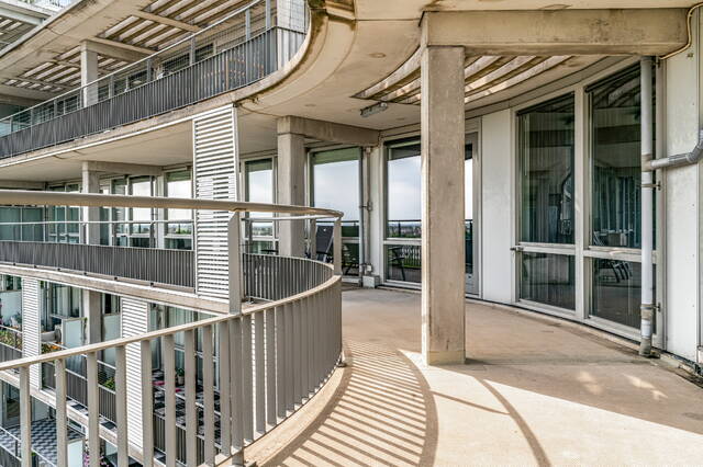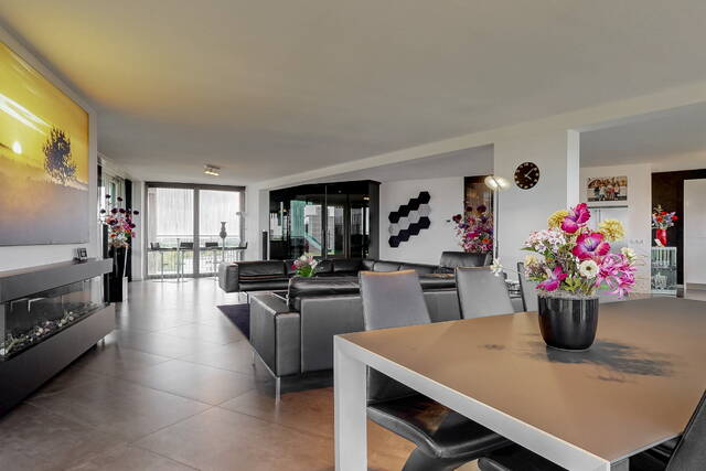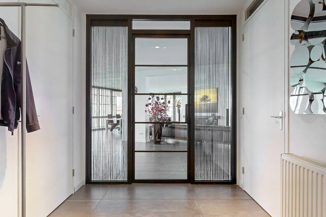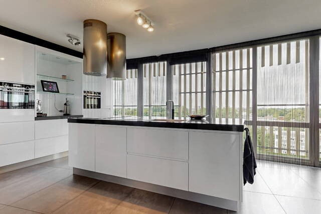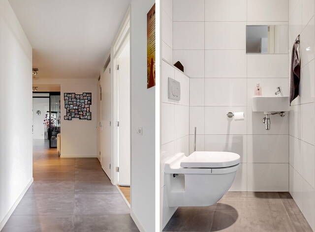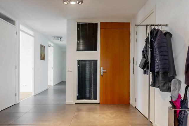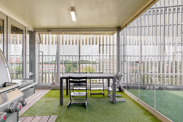 You reach the penthouse via the elevator to the 7th floor. The double entrance, regular and via direct access from the elevator, further emphasizes the penthouse feeling. Upon entering a spacious and bright connecting hall with access to the living room. The living room is overwhelming! That is the feeling that everyone will have upon entering this fantastic living space. An countless number of floor-to-ceiling windows, light from all sides and connecting doors everywhere to the surrounding outdoor spaces. In short, a real penthouse as you would expect from a penthouse. The layout options are endless due to the approximately 140m² of free space. The entire room has comfortable underfloor heating. The walls are plastered smoothly throughout the penthouse. The gray tiled floor has been laid without barriers in the living room and the hall. The underfloor heating, in combination with the air conditioning, provides a climate that can be fully adjusted to your wishes. In addition to the double doors to the conservatory and the terrace, there are also doors to the chamois balcony on the outer ring.