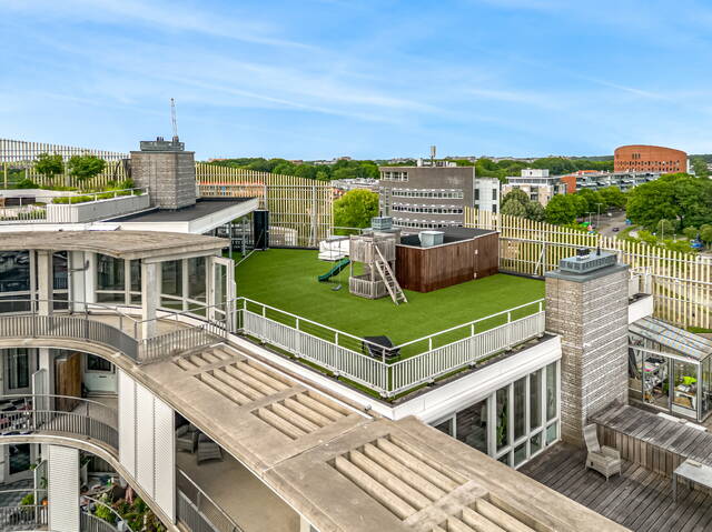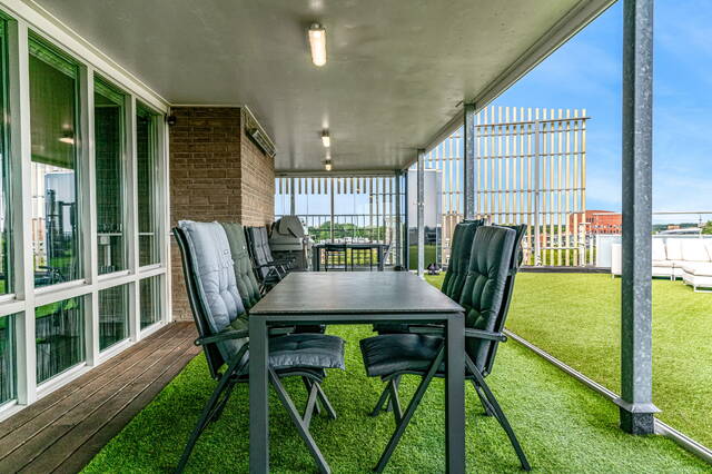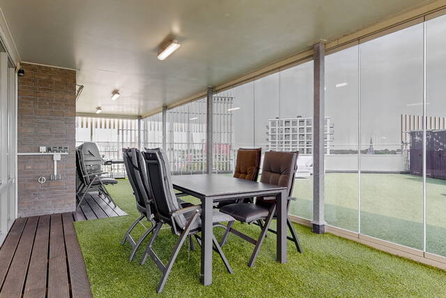 The roof terrace exceeds all superlatives! The terrace has artificial grass with a spacious conservatory and a wooden shed. The views all around are beautiful. The skylines of Rotterdam and The Hague, among others, are clearly visible in clear weather. But of course, there is also a beautiful view closer to home over the center of Alphen aan den Rijn and the Bospark. From the large roof terrace, you continue across the terrace on the inner ring, which has a specially designed sun-permeable concrete canopy. There is also an ingenious sliding sun blind along the terrace on the inner ring.