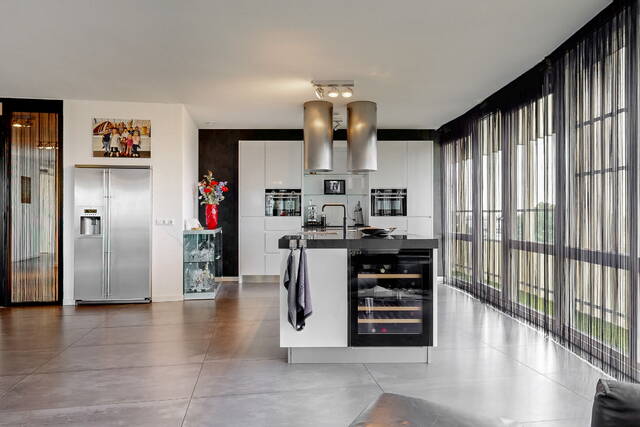 This fully equipped kitchen is equipped with the following built-in appliances: 2 designer extractor hoods with remote control, an induction hob, 2x a combi oven with microwave, a Quooker, a dishwasher and an American fridge/freezer combination with, among other things, an ice cube machine, recessed into the wall separately from the kitchen.