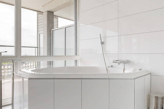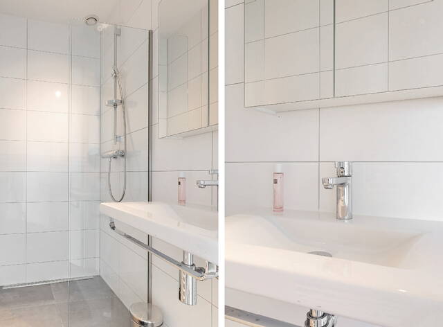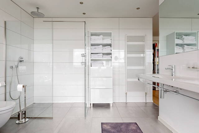 The bathroom is fully equipped, fully tiled and has a suspended ceiling with recessed spotlights. The large window provides beautiful light and good ventilation options. The location of the apartment ensures total privacy. The bathroom has a double designer sink, a custom mirror, a whirlpool corner bath, a second wall-mounted toilet, a large walk-in shower with hand and rain shower and underfloor heating. The second bathroom is also fully tiled and has a design sink, a walk-in shower and a design radiator.