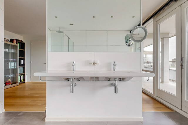 De badkamer is compleet uitgevoerd, volledig betegeld en heeft een verlaagd plafond met inbouwspots. Het grote raam brengt een prachtige lichtinval en goede ventilatiemogelijkheden. Door de ligging van het appartement is er totale privacy. De badkamer is voorzien van een dubbele design wastafel, een maatwerk spiegel, een whirlpool hoekligbad, een tweede wandcloset, een grote inloopdouche met hand- en regendouche en vloerverwarming. De tweede badkamer is eveneens volledig betegeld en is voorzien van een design wastafel, een inloopdouche en een design radiator.
