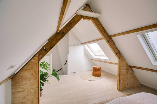 Wat een ruimte! Deze sfeervolle zolderkamer met een nokhoogte van 2.46 m is afgewerkt met houten balken, twee dakramen en voldoende plek voor een tweepersoonsbed én opbergruimte. Perfect als tweede slaapkamer, werkkamer of logeerplek.