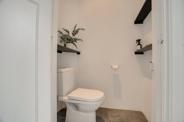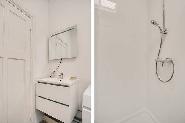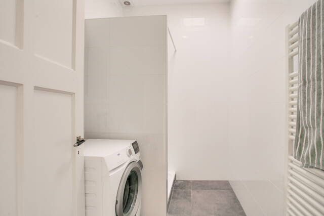 Er zijn twee slaapkamers: een ruime kamer aan de voorzijde en een tweede kamer aan de achterzijde, ideaal als werkplek of logeerkamer. Ook deze kamer heeft openslaande deuren naar het achterbalkon. De badkamer is fris en compact met een douche, wastafelmeubel en aansluiting voor de wasmachine. Het toilet is apart.