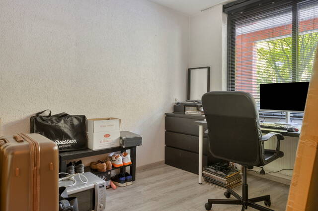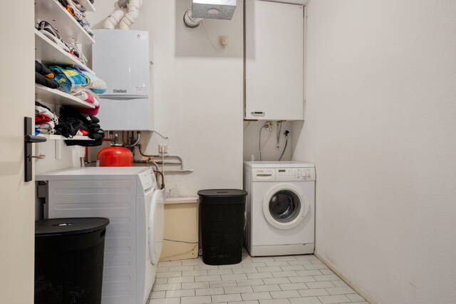Upon entering, you’ll find a spacious hallway that provides access to two bedrooms at the front, a bathroom equipped with a bathtub, shower, and washbasin, and a separate toilet with a small sink. There is also a practical storage room with connections for a washing machine and dryer. The large living room with open kitchen is located at the back of the apartment and has double sliding doors that open directly onto the sunny rear terrace. In addition, the apartment includes a private storage space for bicycles.