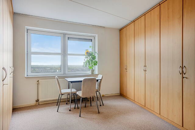 De lichte en sfeervolle woonkamer vormt het kloppend hart van het appartement. Grote raampartijen zorgen voor een overvloed aan daglicht en bieden een schitterend, weids uitzicht over Leiden en het Groene Hart. Er is volop ruimte voor een comfortabele zithoek en een ruime eettafel. Vanuit de woonkamer stap je direct het balkon op: een fijne buitenruimte waar je kunt genieten van de zon, de rust en het panoramische uitzicht dat op heldere dagen zelfs reikt tot aan Den Haag.