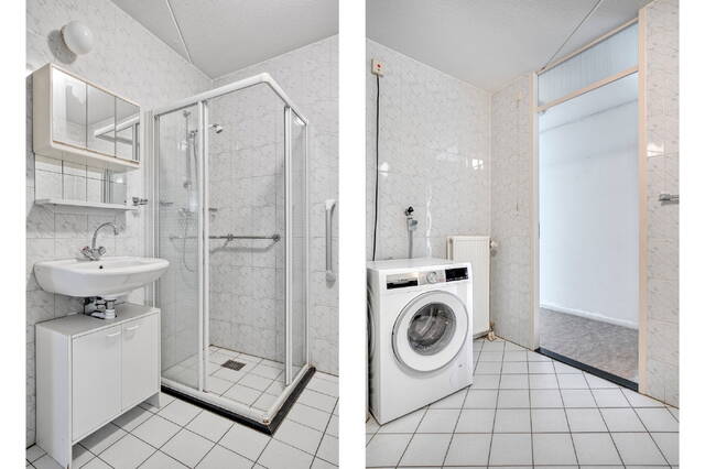 The bathroom is generous in size and fully tiled in a neutral style. It features a shower cabin, washbasin unit, toilet, and bidet. The washing machine connection is also located here.
