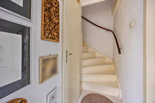 Op de eerste verdieping bevindt zich de entree van de woning. De ruime hal biedt toegang tot de meterkast, een separaat toilet met fontein en de lichte woonkamer. Grote ramen zorgen voor een prachtig uitzicht over de gracht en een overvloed aan daglicht. De woonkamer staat in open verbinding met de eetruimte, waardoor een ruimtelijk gevoel ontstaat. De halfopen keuken ligt aan de achterzijde en is praktisch ingericht. De trapopgang bevindt zich centraal in de ruimte, waardoor de verdieping op een speelse manier is ingedeeld.