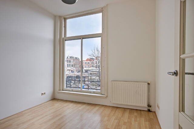 To the right is the bright living room with an open kitchen. The large windows not only provide pleasant natural light but also offer a lovely view of the Beestenmarkt and the Blauwpoortsbrug. The sliding windows also give the apartment a charming, authentic appearance. The open kitchen is equipped with a dishwasher, refrigerator, gas hob, and plenty of storage space. Adjacent is a built-in closet with the central heating boiler, washing machine connection, and additional storage space.