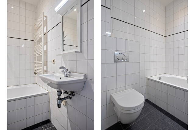 The bedroom is peacefully situated and also features a large window frame, allowing plenty of natural light. The bathroom is spacious and equipped with a bathtub, toilet, sink, and designer radiator.