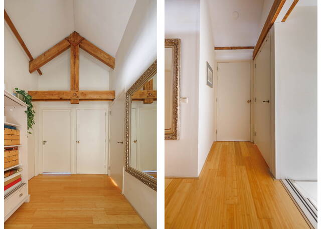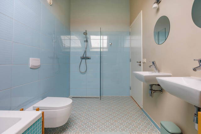 The modern second bathroom is very spacious and includes two washbasins, a bathtub, a walk-in shower, a toilet, and a connection for a dryer. Both this bathroom and the first one (plus the separate toilet) are finished in tasteful colors with elegant floor tiles. From the landing, there is access to a large attic for even more storage space.
