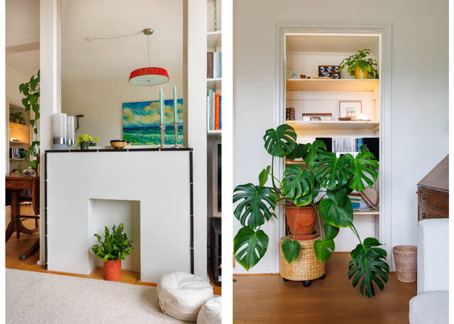 The large and sunny living room consists of two areas: a generous sitting area with a decorative mantelpiece and a dining area with access to a cozy front balcony.