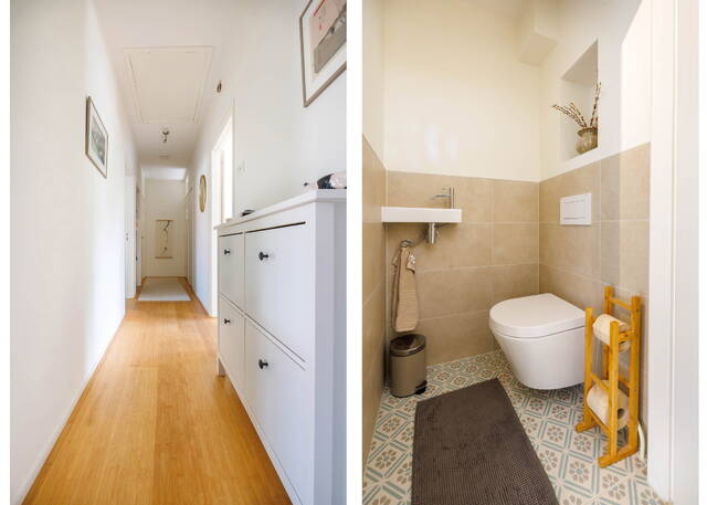 The hallway also leads to the first modern bathroom with a walk-in shower (featuring a niche and glass partition), recessed lighting, mechanical ventilation, and a washbasin cabinet. The separate toilet, finished in the same attractive style, is also accessible from the hall.