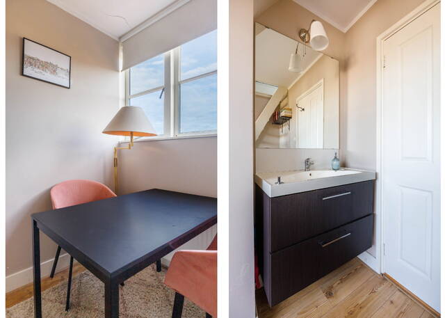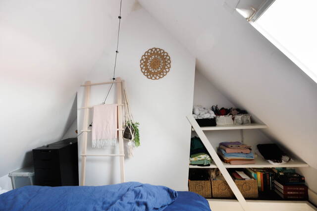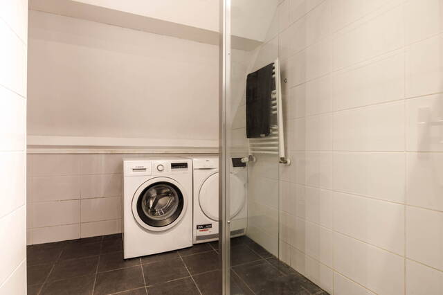 Long landing giving access to the three bedrooms and the bathroom. Two cosy bedrooms with a rear dormer, each with a washbasin unit with mirror, and stairs leading to a mezzanine with a window, currently used as a sleeping area. There is also a spacious and sunny bedroom at the front with a dormer and a washbasin unit with mirror. The generous bathroom features a walk-in shower with glass screen, a toilet, radiator, and mechanical ventilation. The washing machine and dryer connections are also located here.
