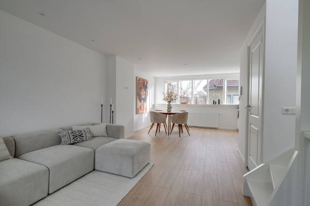 Je betreedt de woning via de trap naar de eerste verdieping, waar de lichte en strak afgewerkte woonkamer direct een ruimtelijk gevoel geeft. De open keuken is modern uitgevoerd met inbouwapparatuur, een inductiekookplaat, afzuigkap ect. Aan de achterzijde bevindt zich het dakterras. Verder vind je op deze verdieping een separate toiletruimte.