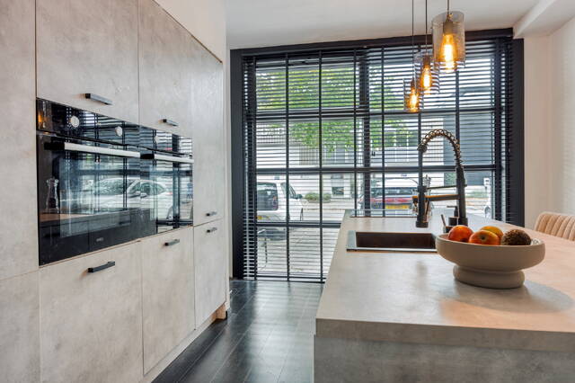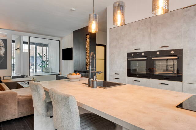 Via de entree kom je binnen in een ruime hal die toegang geeft tot een werkkamer (welke omgebouwd kan worden tot een tweede slaapkamer) en woonkamer. De lichte en royale woonkamer vormt het hart van de woning en biedt volop ruimte voor zowel een zit- als eetgedeelte. De moderne open keuken is uitgerust met een kookeiland en voorzien van alle nodige inbouwapparatuur, ideaal voor kookliefhebbers.