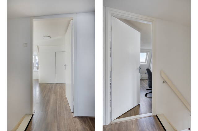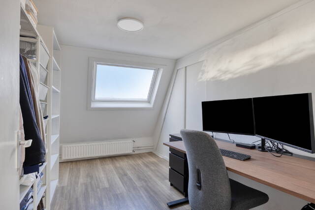 Overloop met toegang tot de tweede en derde slaapkamer. De eerste slaapkamer, gelegen aan de achterzijde is perfect te gebruiken als kinderkamer, werkkamer of als grote inloopkast. De ruime hoofdslaapkamer aan de voorzijde beschikt over een grote inbouwkast en biedt toegang tot de moderne en stijlvolle en suite badkamer. Deze is voorzien van een ligbad, douche, wastafelmeubel, toilet en wasmachineaansluiting. Mede door het dakraam een comfortabele en rustgevende plek om de dag te beginnen of af te sluiten.