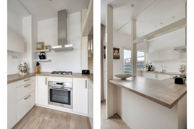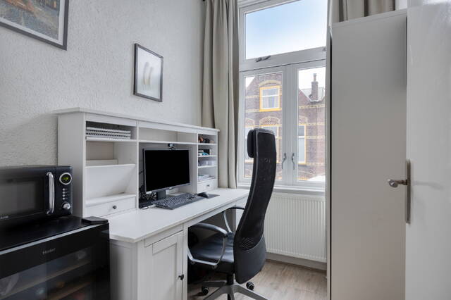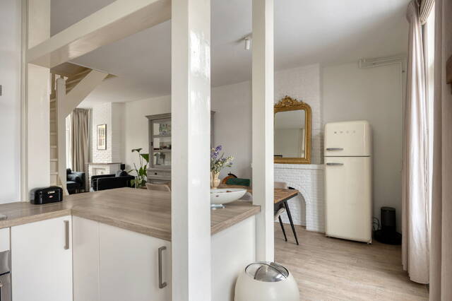 De overloop geeft toegang tot het gemoderniseerde toilet met fonteintje, uitgevoerd in dezelfde stijlvolle afwerking als de badkamer. Aan de voorzijde bevindt zich de eerste slaapkamer, die dankzij de prettige lichtinval ook uitstekend geschikt is als werkkamer. De lichte woonkamer vormt het hart van de woning. Het hoge plafond en de originele schouwen zijn echte blikvangers en geven de ruimte karakter. De woonkamer loopt naadloos over in de moderne keuken aan de achterzijde, voorzien van een gaskookplaat, vaatwasser, koelkast en afzuigkap.