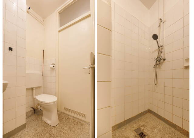 Entrance. Hallway with access to the bathroom and living room. The bathroom features an original granito floor and is equipped with a shower, toilet, and washbasin.