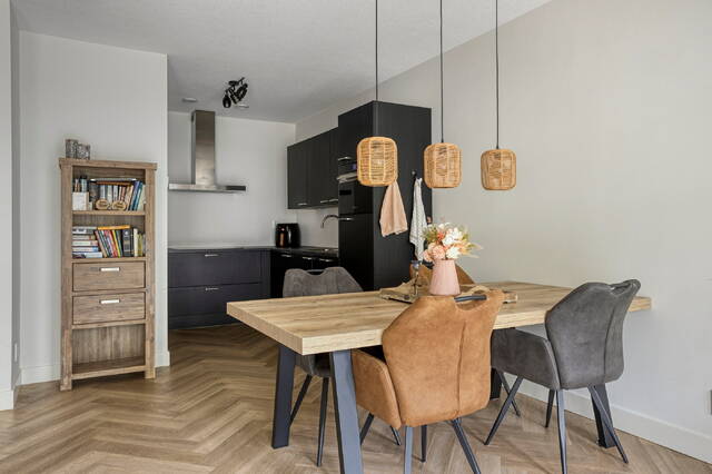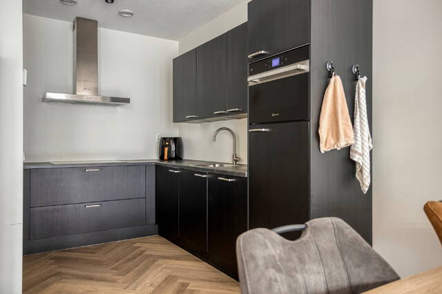 Het appartement is gelegen op de derde verdieping en biedt een royale woonoppervlakte met een prettige, lichte indeling. De woonkamer vormt samen met de open keuken het hart van de woning. De keuken is modern en luxe uitgevoerd en voorzien van complete inbouwapparatuur, waaronder een inductiekookplaat, oven, magnetron, vaatwasser en een ruime koel-vriescombinatie. De stijlvolle pvc-visgraatvloer in combinatie met vloerverwarming en -koeling zorgt voor optimaal wooncomfort in elk seizoen.