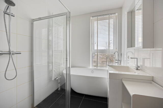 De badkamer is modern uitgevoerd en voorzien van een inloopdouche, ligbad en wastafelmeubel. Het toilet is separaat en bereikbaar vanuit de hal. Daarnaast zijn er twee praktische berg-/technische ruimtes aanwezig, waaronder een aparte wasruimte en een ruimte voor de WTW-installatie.