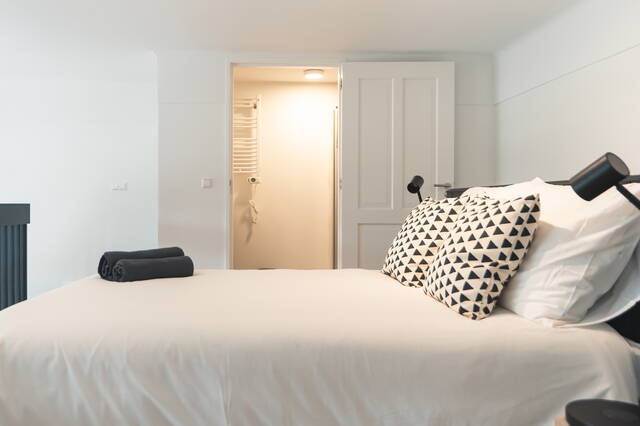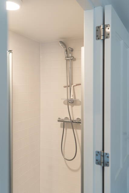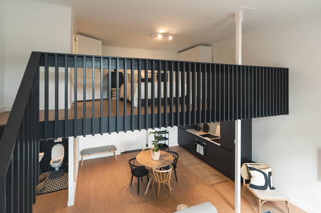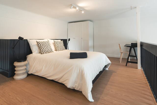 De open trap leidt naar de bovenverdieping met uitzicht op de woonruimte. Hier bevindt zich de slaapkamer, inclusief een compacte, goed ingedeelde badkamer met douche en wastafel. Plafondhoogte op deze verdieping is circa 2,40 meter.