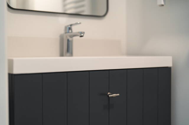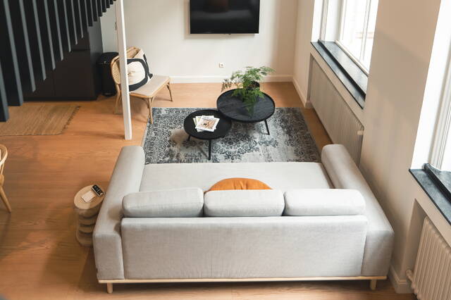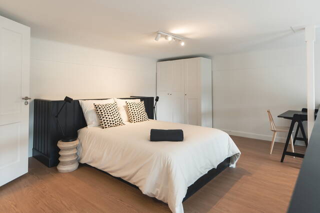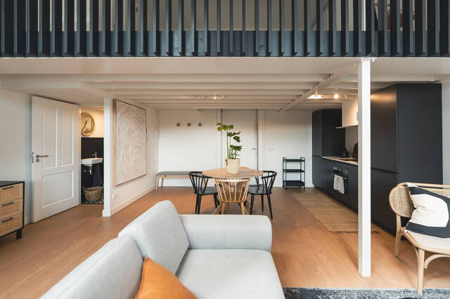 Via de eigen entree stap je de ruime woonkamer binnen. Dankzij de plafondhoogte en de grote raampartijen voelt het hier licht en open aan. Aan de voorzijde bevindt zich de nette open keuken, voorzien van modern keukenblok en inbouwapparatuur. Aangrenzend een separaat toilet – praktisch en gastvriendelijk.