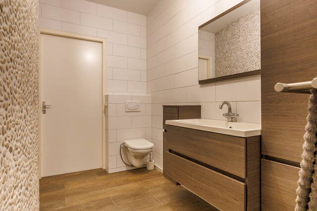 De tweede badkamer beschikt over een tweede toilet, een wastafelmeubel met kasten, een inloopdouche en een handdoekenradiator. Beide badkamers zijn modern en volledig betegeld.