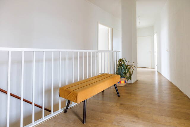 Entree van het appartement met meterkast, garderobe en trapopgang naar de eerste verdieping. De hal is breed opgezet, waardoor het plaatsen van een traplift hier uitstekend mogelijk is. Dit maakt het appartement zeer geschikt als levensloopbestendige woning.