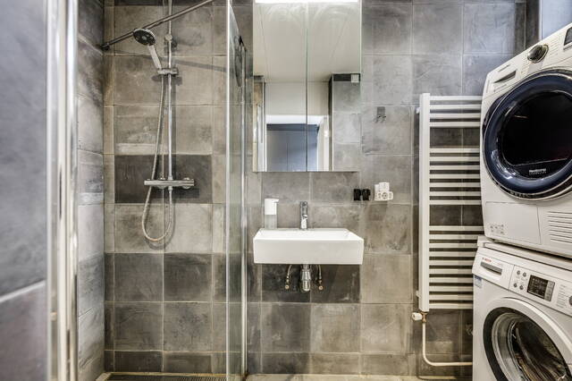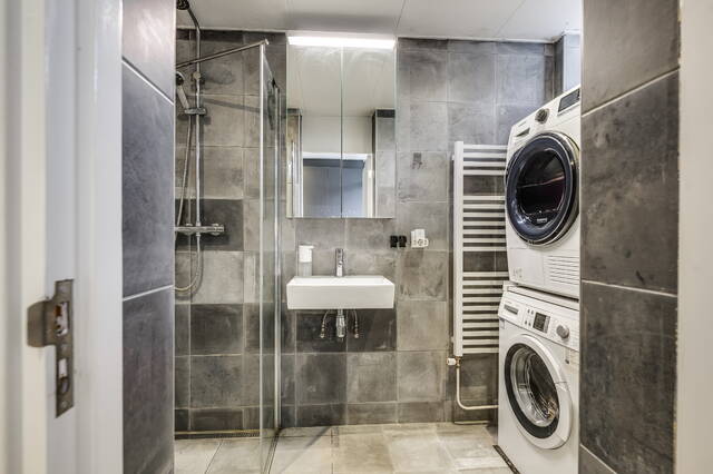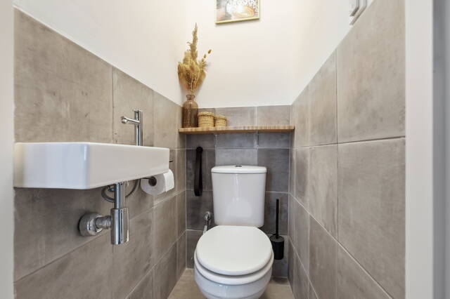 De nette badkamer beschikt over een inloopdouche, wastafelmeubel, aansluitingen voor wasmachine en droger en inbouwspotjes. Via een tussenhal bereikt u de meterkast (5 groepen + aardlekschakelaar), het separate toilet en een vaste ruimte met de opstelplaats van de Remeha combiketel (bouwjaar 2022).