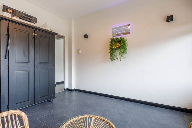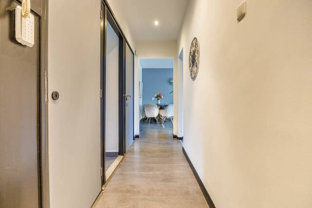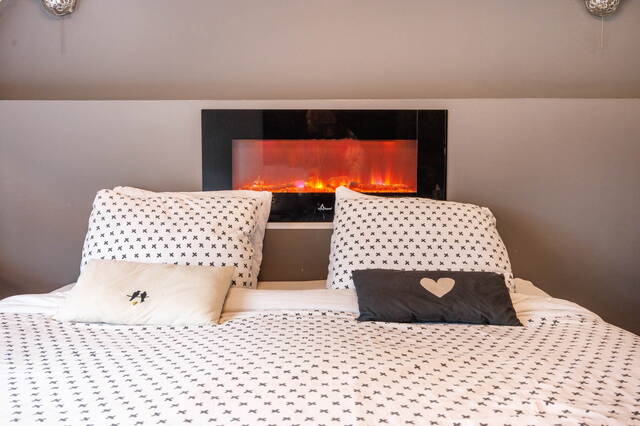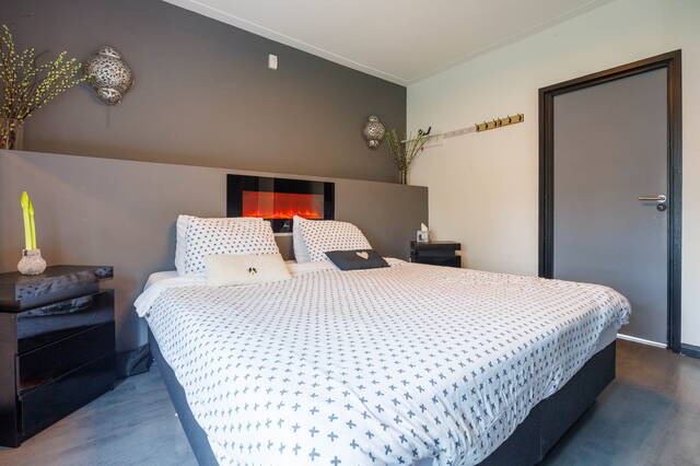 Entree van het appartement. Ruime hal met meterkast en een toilet. Royale en lichte woonkamer met een op maat gemaakt tv-meubel en een elektrische sierhaard die veel sfeer creëert. Vanuit de woonkamer is er toegang tot de eerste slaapkamer aan de achterzijde van het appartement, voorzien van een ingebouwd hoofdbord met eveneens een sfeervolle sierhaard.