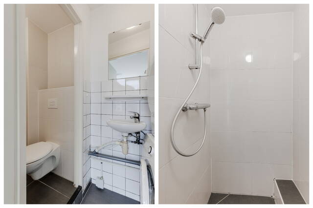 De badkamer is compact en functioneel, voorzien van douche, toilet en wastafel. Tevens is er ruimte voor wasmachine/wasdroger.