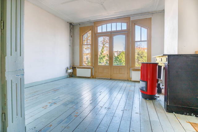 Spacious and bright landing with a skylight, providing access through two doors to a very large and sunny (bed)room at the front (formerly two rooms). Here too, the high ceilings and large windows create wonderful natural light. The room also features a characteristic fireplace mantel with stove and an additional skylight.
