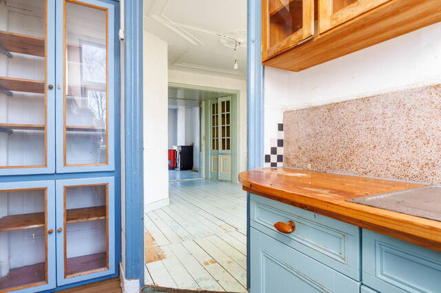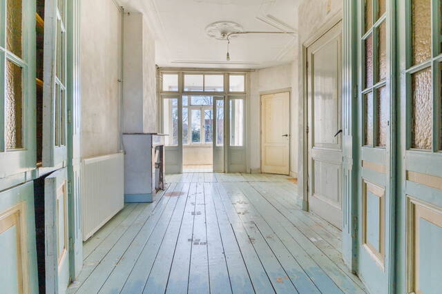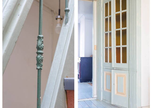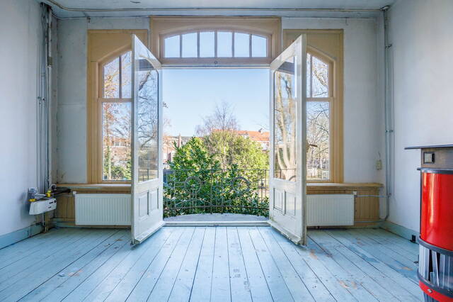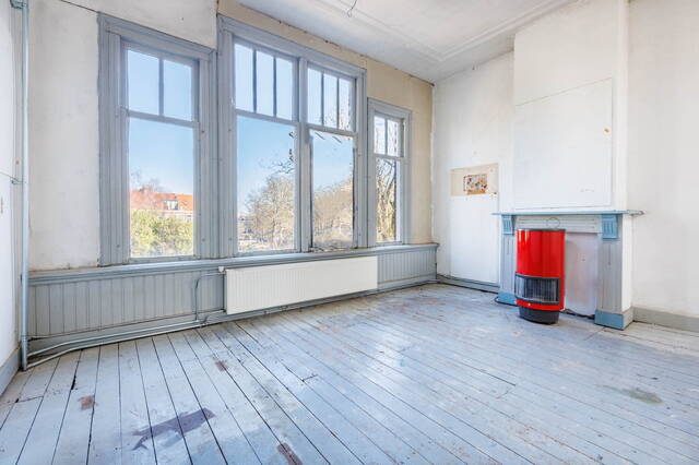 Landing with access to the living room, dining room, toilet, and a large built-in storage cupboard. The generous and bright living room at the front is characterized by beautiful authentic high windows, high ceilings, and an attractive fireplace mantel. French doors open onto the rounded balcony with original railings, where you can fully enjoy the lovely views of the green surroundings and the water.