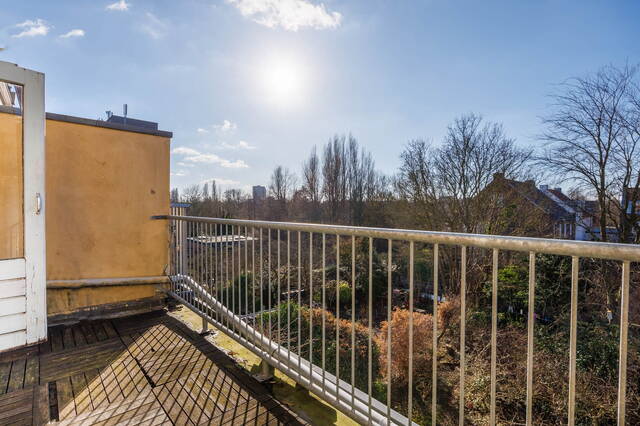 Aan de achterzijde bevindt zich nog een (slaap)kamer met een originele schouw. Via openslaande deuren is er toegang tot het royale balkon/dakterras, waar je heerlijk kunt genieten van de middag- en avondzon en het fraaie uitzicht.