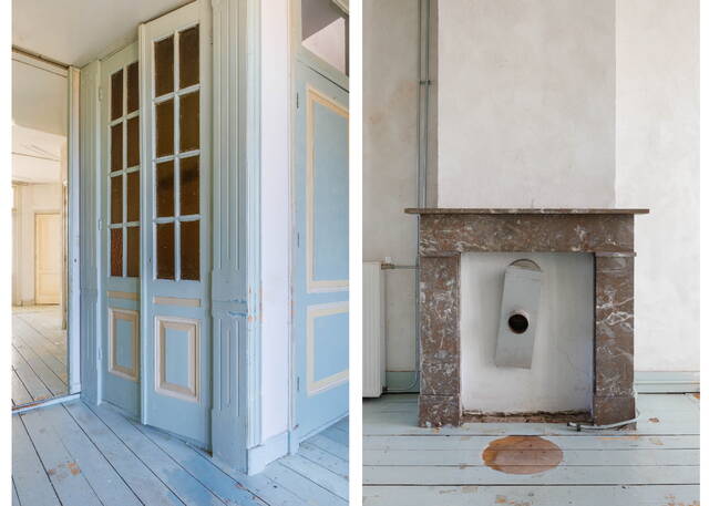 At the rear, there is another (bed)room with an original fireplace mantel. French doors provide access to the generous balcony/roof terrace, where you can enjoy the afternoon and evening sun and the attractive views.