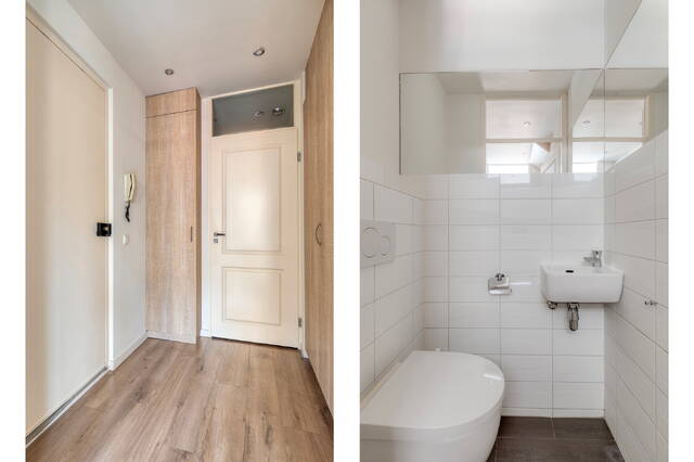 Entree met intercom en een praktische ingebouwde garderobekast. Het toilet is strak afgewerkt en heeft een fonteintje.