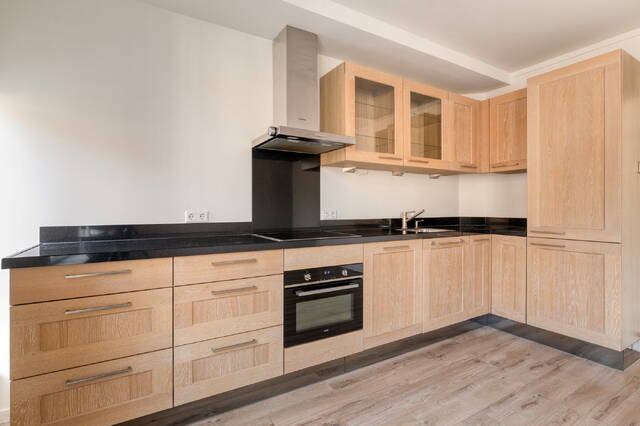 De ruime, lichte woonkamer met open keuken vormt het hart van het appartement en heeft door de grote ramen veel natuurlijk licht. De moderne keuken is van alle gemakken voorzien, met volop bergruimte in de vele lades, een elektrische kookplaat, RVS-afzuigkap, combi-oven, vaatwasser en koelvriescombinatie.