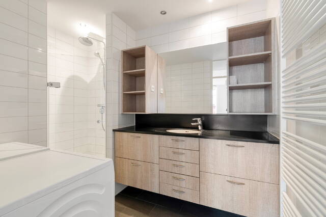 Op deze verdieping bevindt zich ook de badkamer, uitgevoerd met een comfortabele douche, een stijlvol wastafelmeubel en een designradiator.