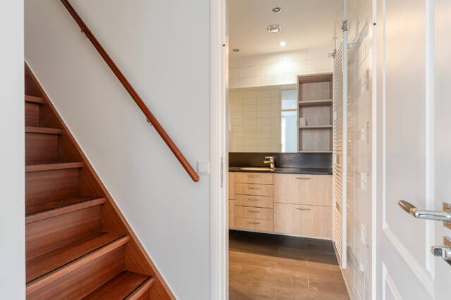 The bathroom is also located on this floor and features a comfortable shower, a stylish washbasin unit, and a designer radiator.