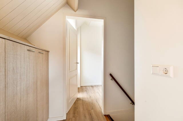 Op de tweede verdieping bevinden zich twee slaapkamers. De royale hoofdslaapkamer beschikt over fraaie inbouwkasten met veel bergruimte, krijgt volop daglicht en heeft een charmant rond raam in de voorgevel dat een echte eyecatcher vormt. De tweede slaapkamer biedt toegang tot een balkon en is veelzijdig te gebruiken: ideaal als werk- of hobbyruimte, maar er is ook voldoende plek voor een bed.