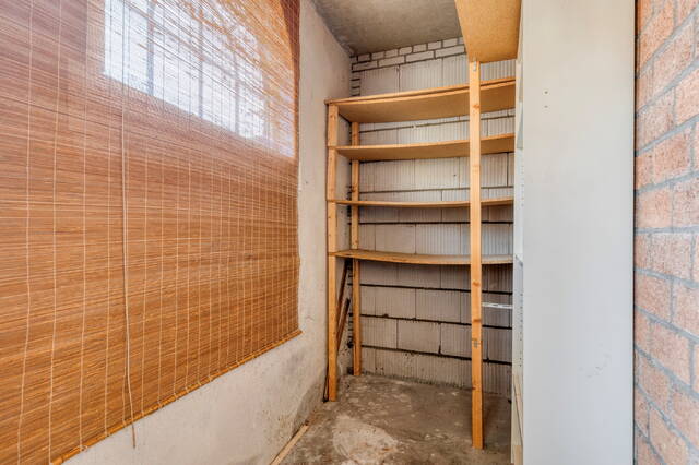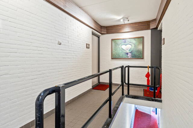 You enter the building via the shared entrance on the ground floor, which is equipped with mailboxes and an intercom panel. The private storage unit is also located here. A staircase leads to the apartment on the first floor.
