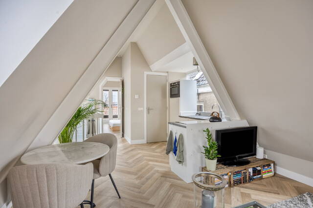 The bright living area features two large dormer windows and offers attractive views over the water and the Beestenmarkt at the front. The open-plan layout creates a light, modern and inviting atmosphere.
