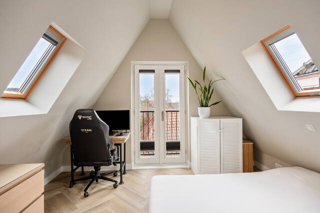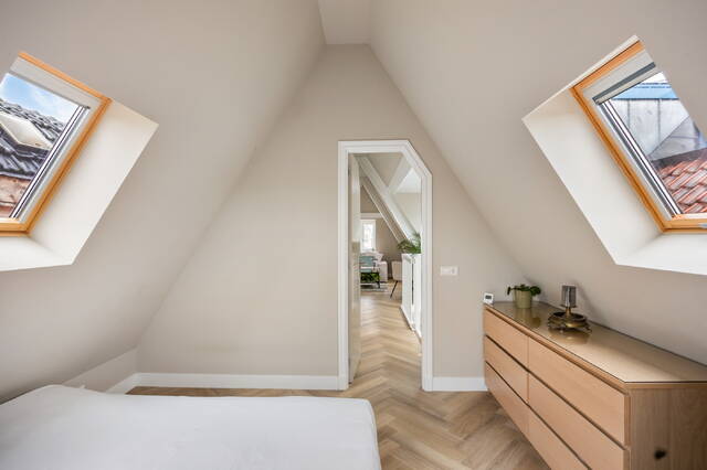 De slaapkamer ligt aan de rustige achterzijde en beschikt over een Frans balkon en twee grote dakramen, wat zorgt voor veel licht en een rustige sfeer.