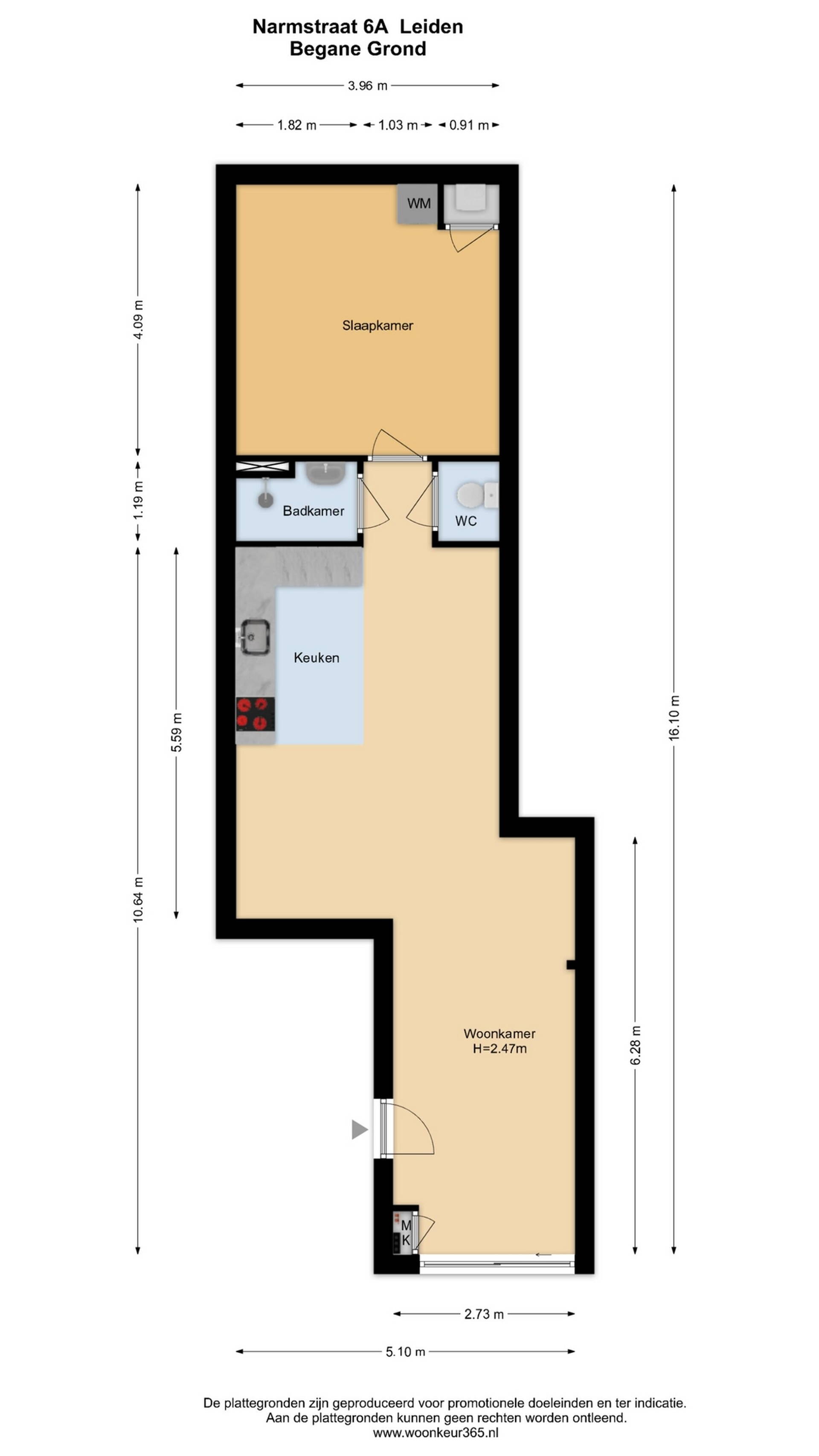 - Woning van 59 m², gebruiksoppervlakte van 43 m² + een overige inpandige ruimte van 16 m², die als slaapkamer wordt gebruikt