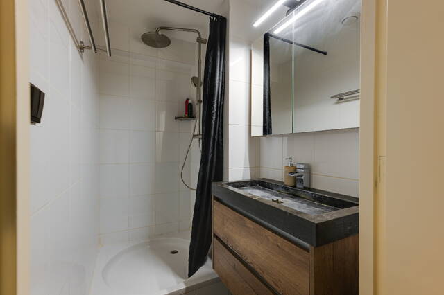 De badkamer is modern uitgevoerd en beschikt over een inloop douche en wastafel. Daarnaast is er een separaat toilet aanwezig.