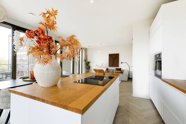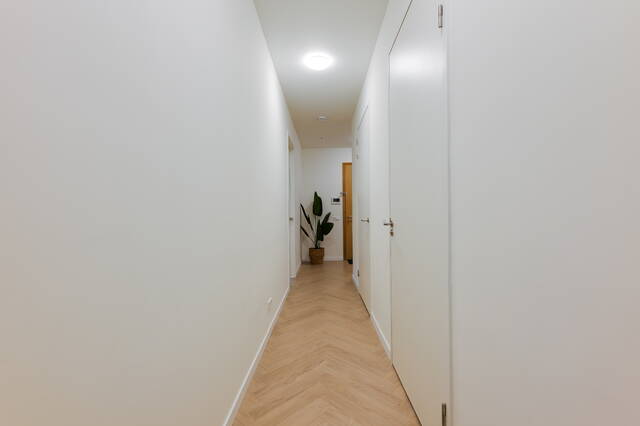 Ruime hal met toegang tot alle vertrekken. De royale en lichte woonkamer vormt het hart van de woning en biedt volop ruimte voor een comfortabele zithoek en een ruime eettafel. Dankzij de moderne bouw en grote raampartijen is de lichtinval bijzonder prettig. De woonkamer is afgewerkt met een nette visgraatvloer en biedt daarnaast fraai zicht op de prijswinnende binnentuin, ontworpen door Piet Oudolf.
