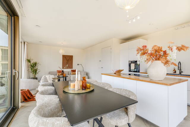 De open keuken met kookeiland sluit naadloos aan op de leefruimte en biedt een moderne en praktische opstelling voorzien van een koel-vriescombinatie, stoomoven, vaatwasser en inductiekookplaat met geïntegreerde afzuiging.