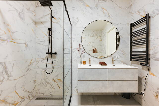 De badkamer is modern uitgevoerd met inloopdouche, een meubel met dubbele wastafels en een hangend toilet. De woning beschikt over comfortabele vloerverwarming en vloerkoeling via de warmtepompinstallatie.