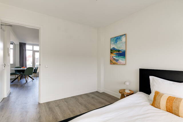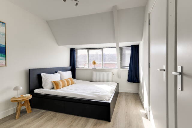 De slaapkamer ligt aan de voorzijde en biedt ruimte voor een tweepersoonsbed en kastruimte.